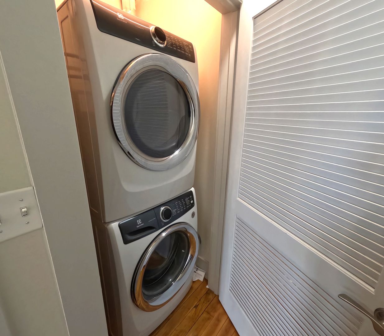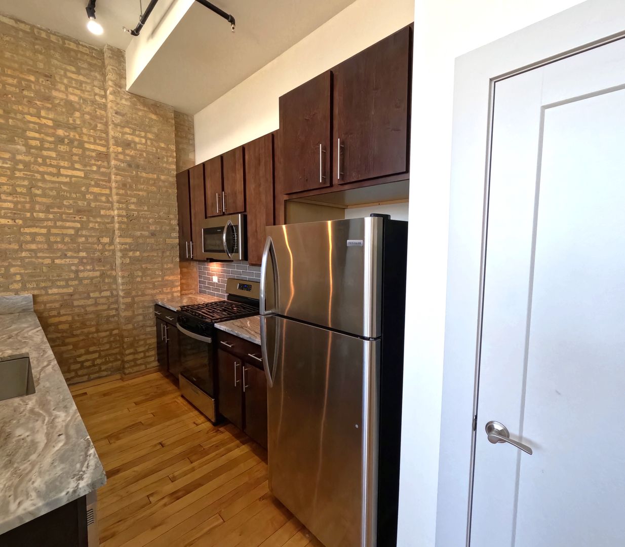 hardwood floors throughout the whole apartment, granite countertops, and stainless steel appliances, washer and dryer in unit, back balcony Skylights